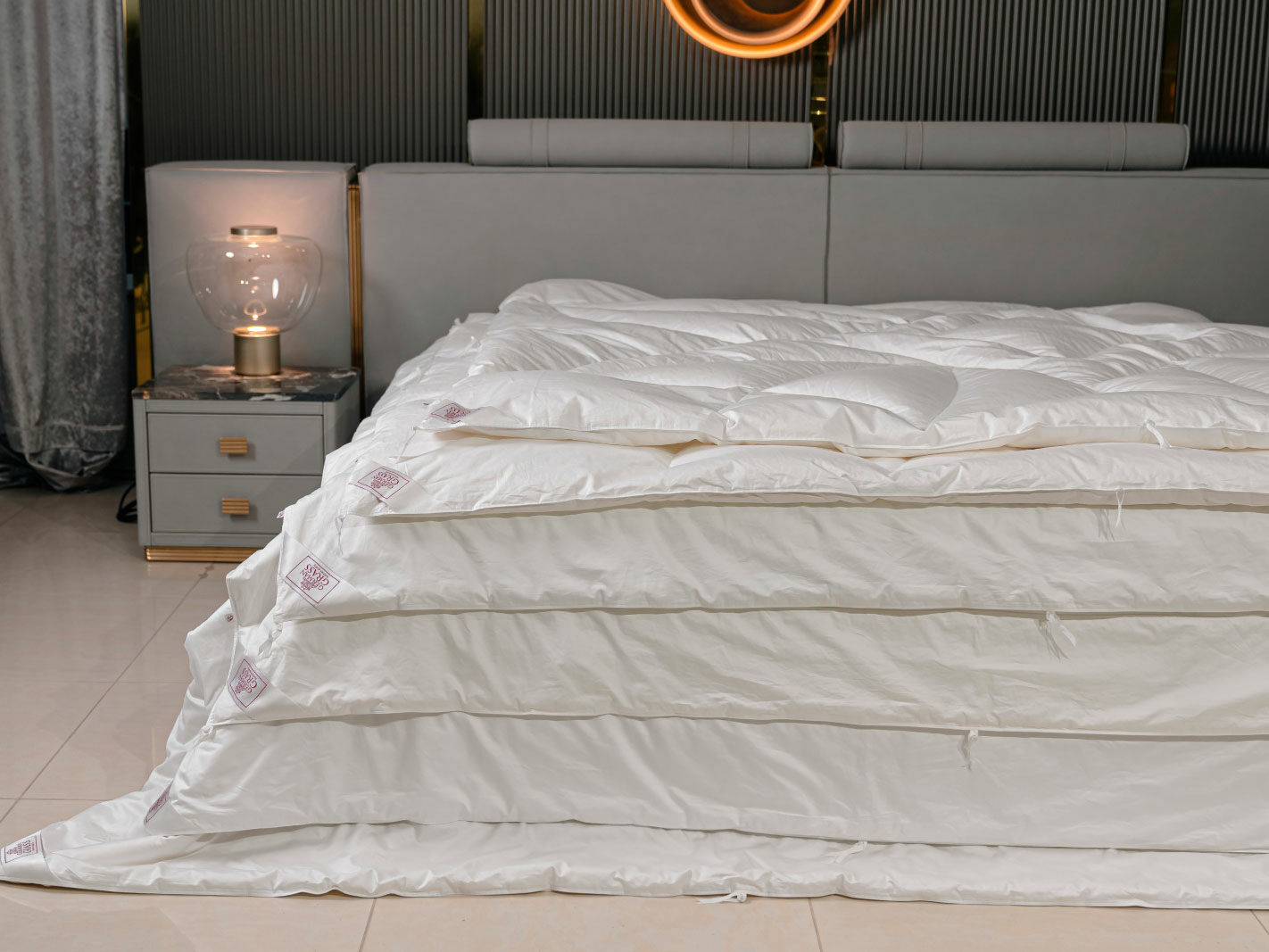 Альянс из одеял с наполнителями из отборного белого гусиного пуха и шелка высшего качества Mulberry.