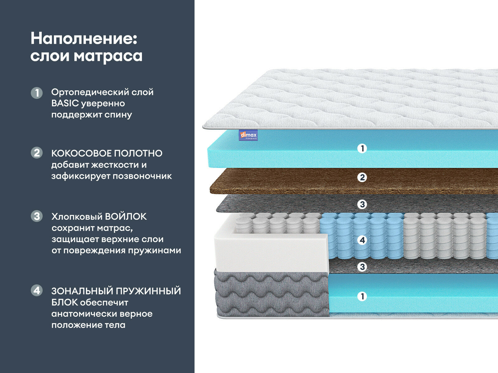 Матрас Димакс Биг Лайт Хард — это высокотехнологичная модель с двусторонней жёсткостью, которая оптимальна для тех, кто ценит устойчивую и надёжную поддержку во время сна. Матрас базируется на 5-зональном пружинном блоке, что позволяет ему лучше распределять нагрузку и аккуратнее поддерживать тело.