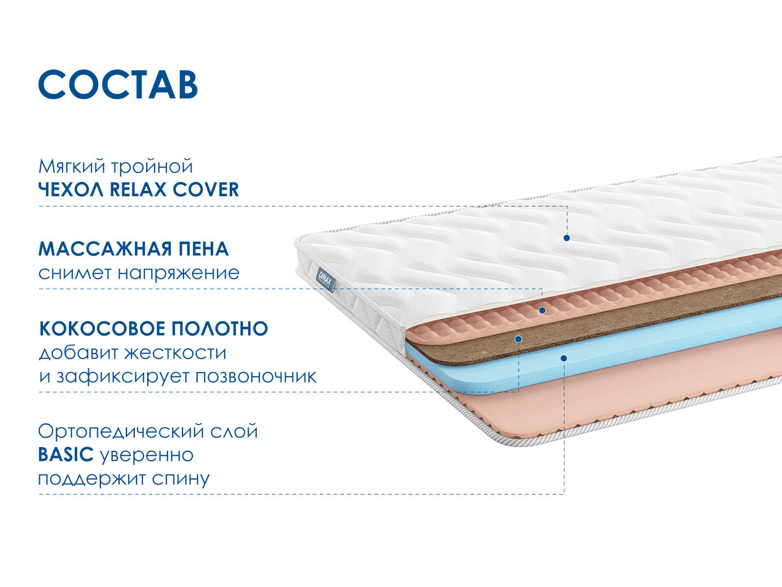 Димакс Relmas Cocos Roll – двусторонний ортопедический матрас с массажным эффектом. Модель обладает разной жёсткостью сторон – средней и выше среднего. Беспружинный состав делает модель устойчивой к частым нагрузкам.