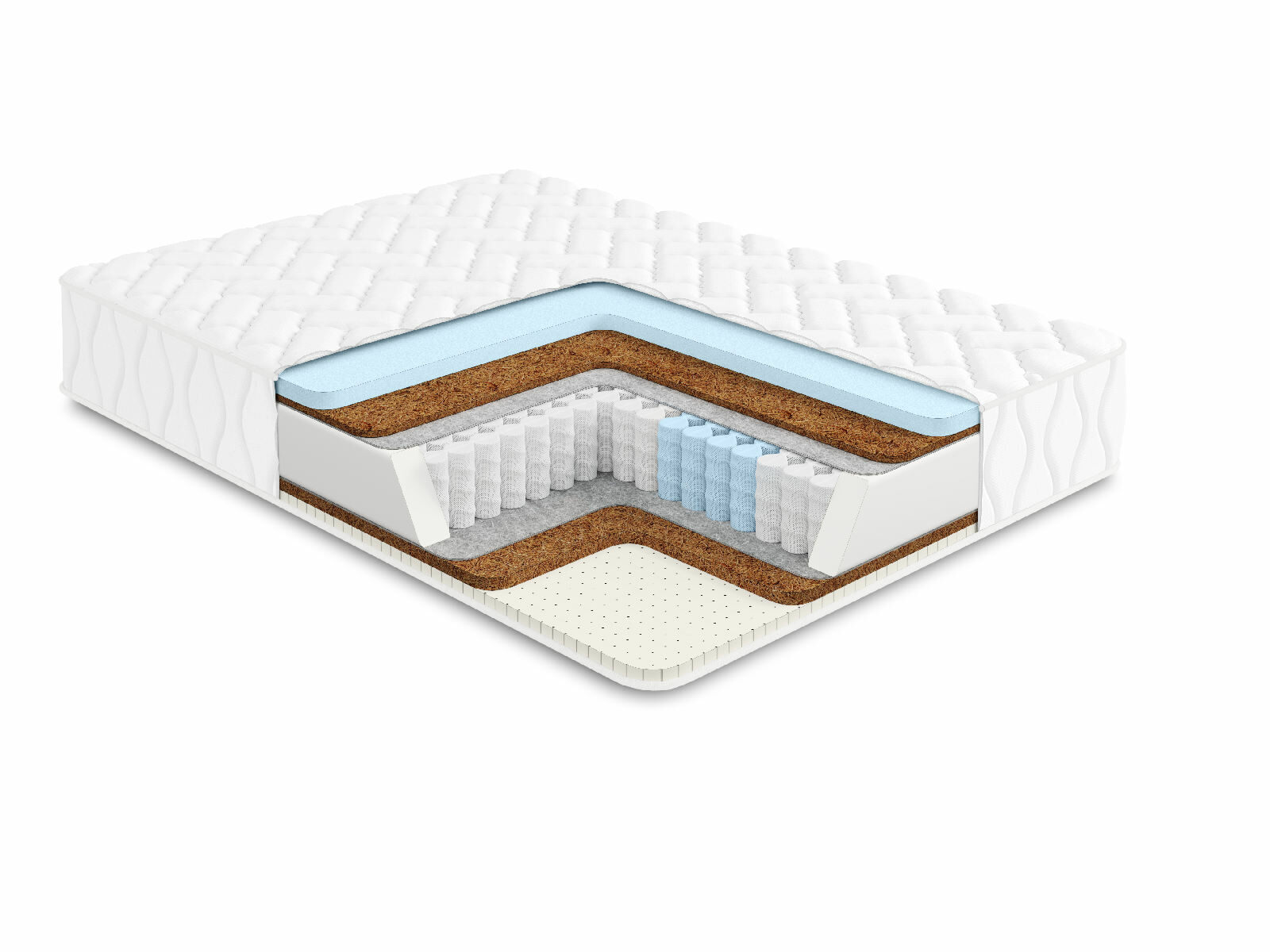 За поддержку спины и расслабление отвечает комбинация из кокосовой койры и натурального перфорированного латекса. Если латекс даёт мягкость и адаптивность, то кокос своей умеренной жёсткостью обеспечивает корректную поддержку для позвоночника – он принимает анатомически правильное положение. Поверхность имеет классическую среднюю жёсткость.