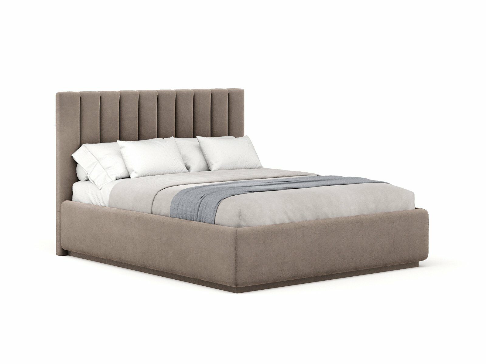 Кровать с мягким изголовьем, выполненным в виде 10 вертикальных панелей (вертикальная утяжка, всегда 10 шт независимо от размера спального места, с увеличением размера спального места увеличивается ширина панели), отличный вариант для спален с низкими потолками: вертикальный полосы на изголовье визуально вытягивают пространство.
