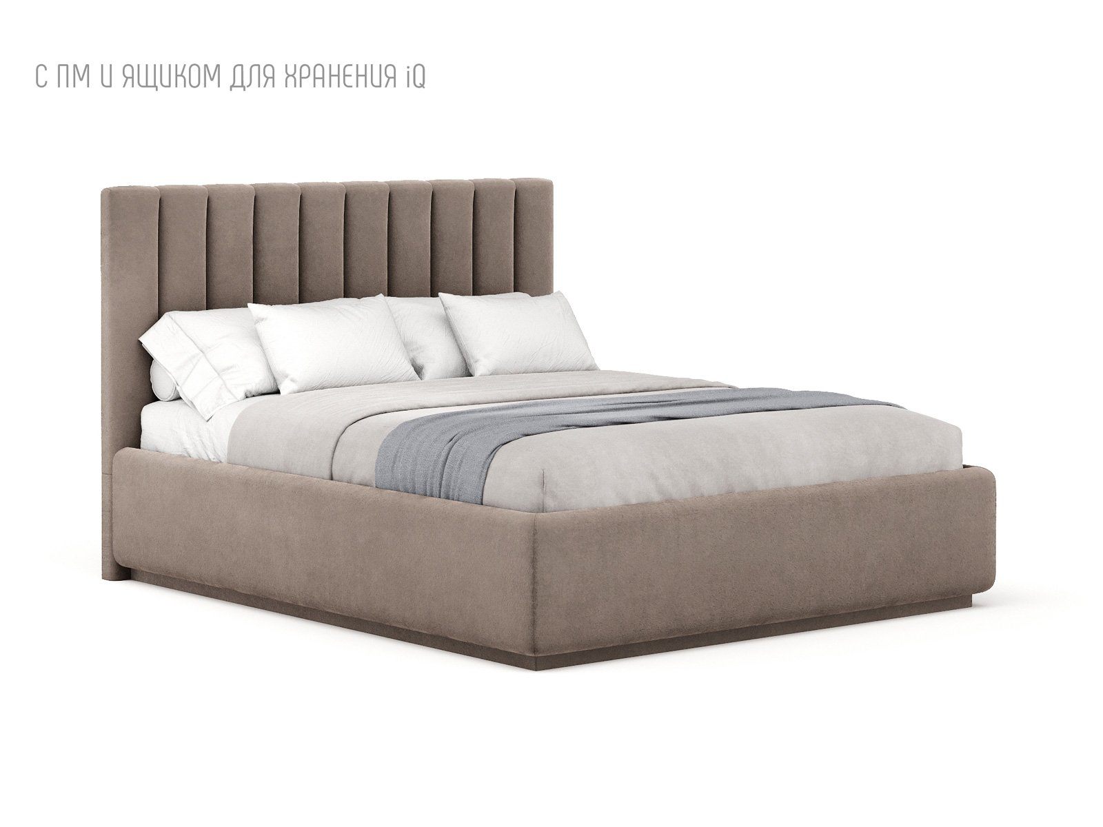 Кровать укомплектована IQ с подъемным механизмом и ящиком для белья без дна (дополнительная платная опция - дно к ящику IQ из HDF (ХДФ). Каркас кровати на цоколе, декоративный чехол на цоколе съёмный. Глубина ящика для белья - 30 см, без ограничения нагрузки на ящик.