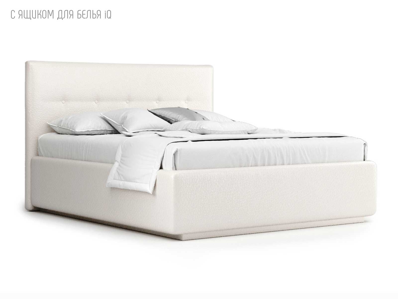 Кровать укомплектована IQ с подъемным механизмом и ящиком для белья без дна (дополнительная платная опция - дно к ящику IQ из HDF (ХДФ). Каркас кровати на цоколе, декоративный чехол на цоколе съёмный. Глубина ящика для белья - 30 см, без ограничения нагрузки на ящик.