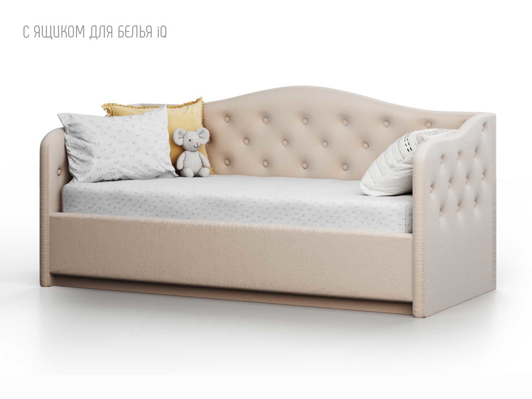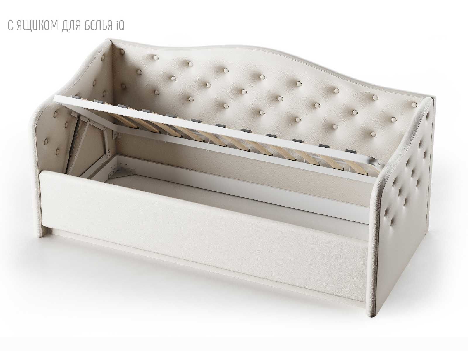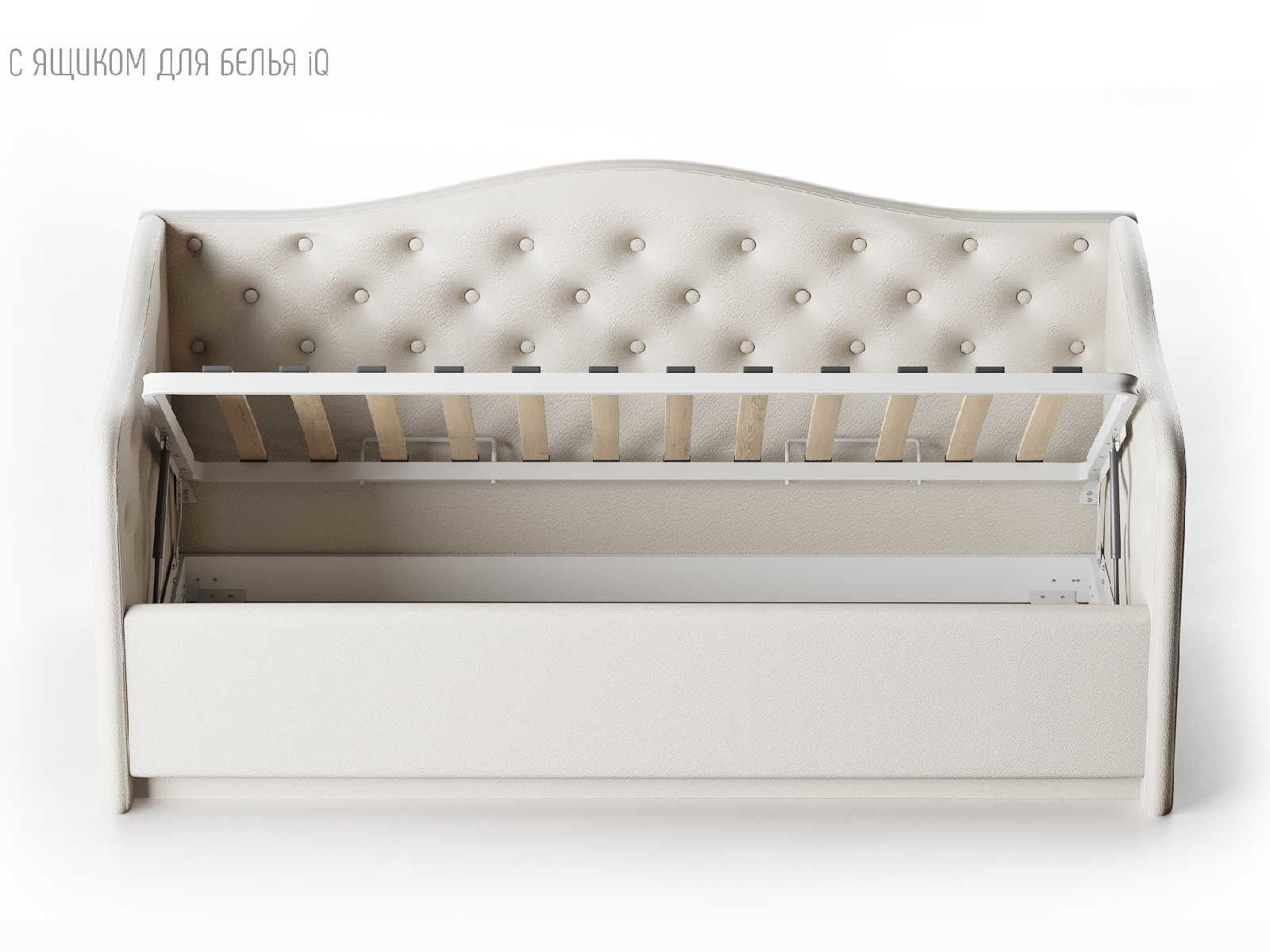 Кровать укомплектована IQ с подъемным механизмом и ящиком для белья без дна (дополнительная платная опция - дно к ящику IQ из HDF (ХДФ). Каркас кровати на цоколе, декоративный чехол на цоколе съёмный. Глубина ящика для белья - 30 см, без ограничения нагрузки на ящик.