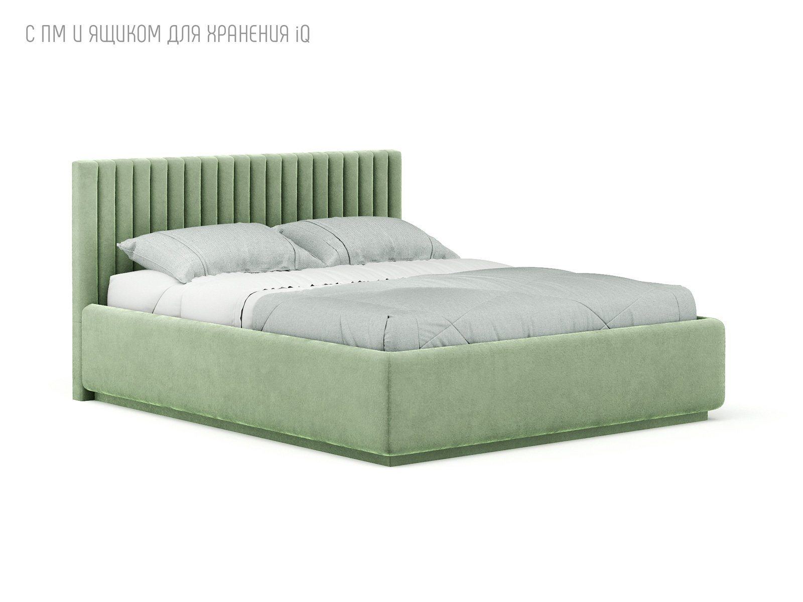 Кровать укомплектована IQ с подъемным механизмом и ящиком для белья без дна (дополнительная платная опция - дно к ящику IQ из HDF (ХДФ). Каркас кровати на цоколе, декоративный чехол на цоколе съёмный. Глубина ящика для белья - 30 см, без ограничения нагрузки на ящик.