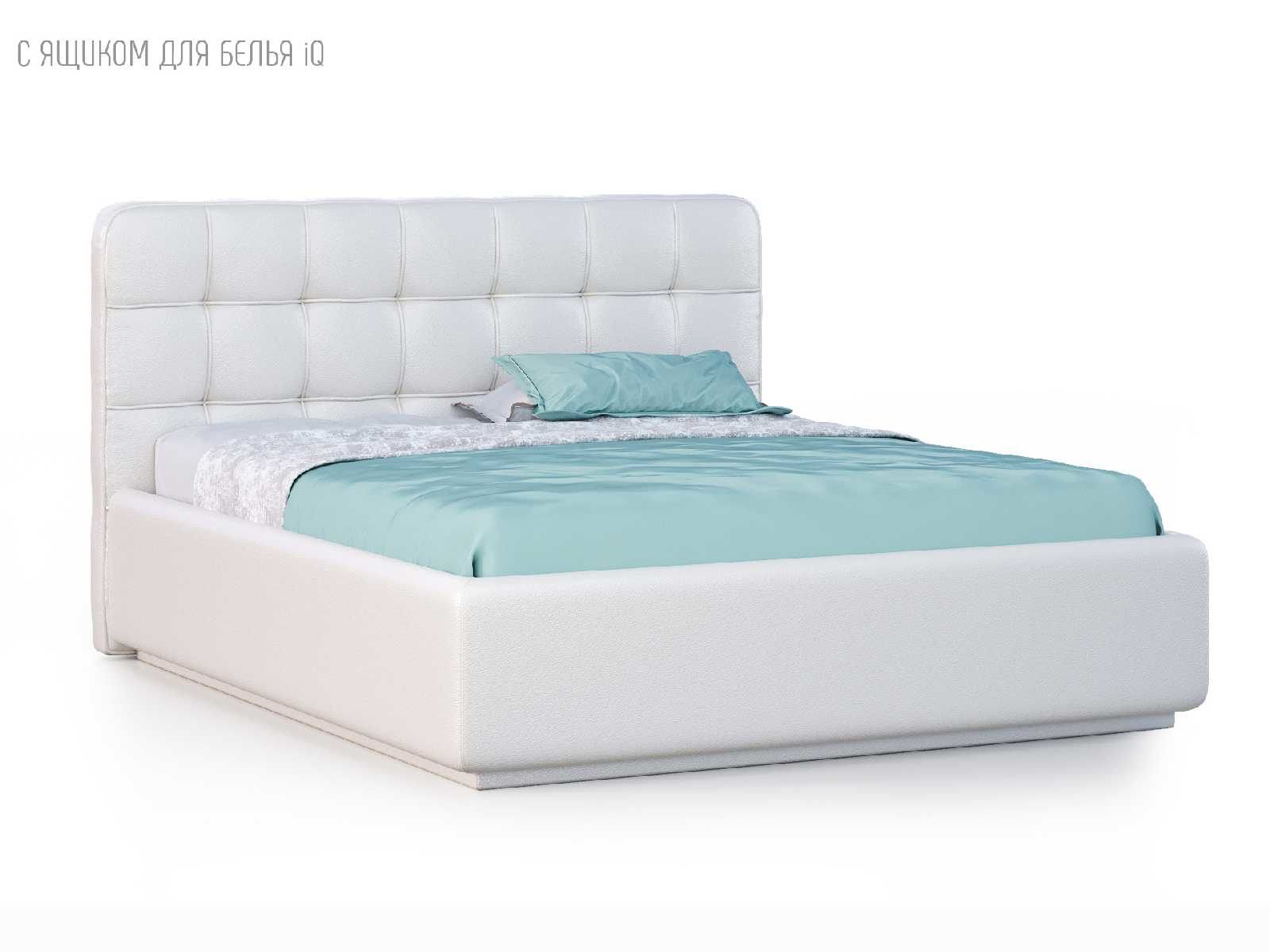 Кровать укомплектована IQ с подъемным механизмом и ящиком для белья без дна (дополнительная платная опция - дно к ящику IQ из HDF (ХДФ). Каркас кровати на цоколе, декоративный чехол на цоколе съёмный. Глубина ящика для белья - 30 см, без ограничения нагрузки на ящик.