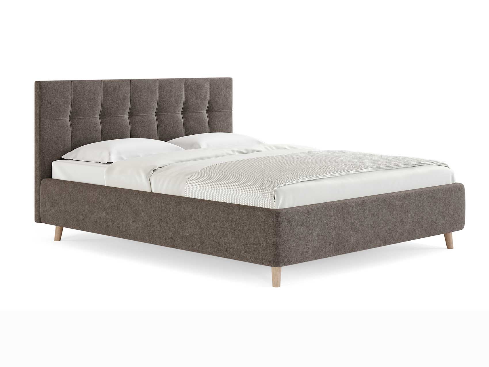 Двуспальная кровать с мягким изголовьем подойдет для современных интерьеров спален, а благодаря высоким деревянным ножкам впишется в стиль ретро, скандинавский или минимализм.