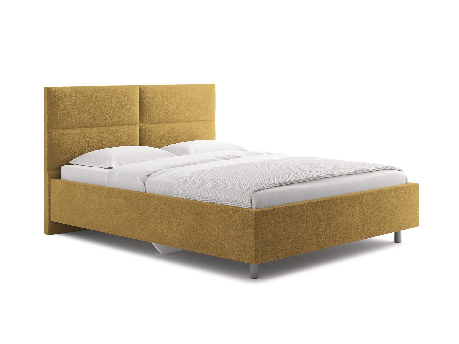 Лаконичная модель с изголовьем из объемных прямоугольников, сшитых между собой. Царги кровати выполняются по технологии съемного чехла. Модель изготовлена из ДСП. Обратная сторона изголовья обита спандбондом, но, при желании, её можно выполнить из основного обивочного материала.