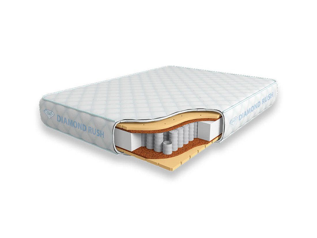 Матрас Diamond Rush Comfy-2 725DR имеет в своей основе независимый пружинный блок 725, состоящий из пружин диаметром 5-6 см. В качестве настилочных слоев поверх пружинного блока используются листы латексированной кокосовой койры (1см) и натурального латекса с перфорацией (2см). Стороны матраса идентичны по жесткости.