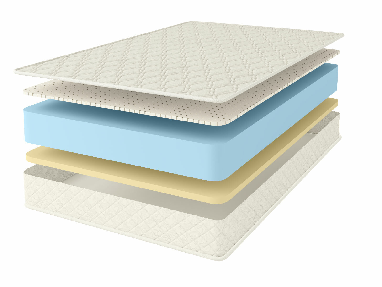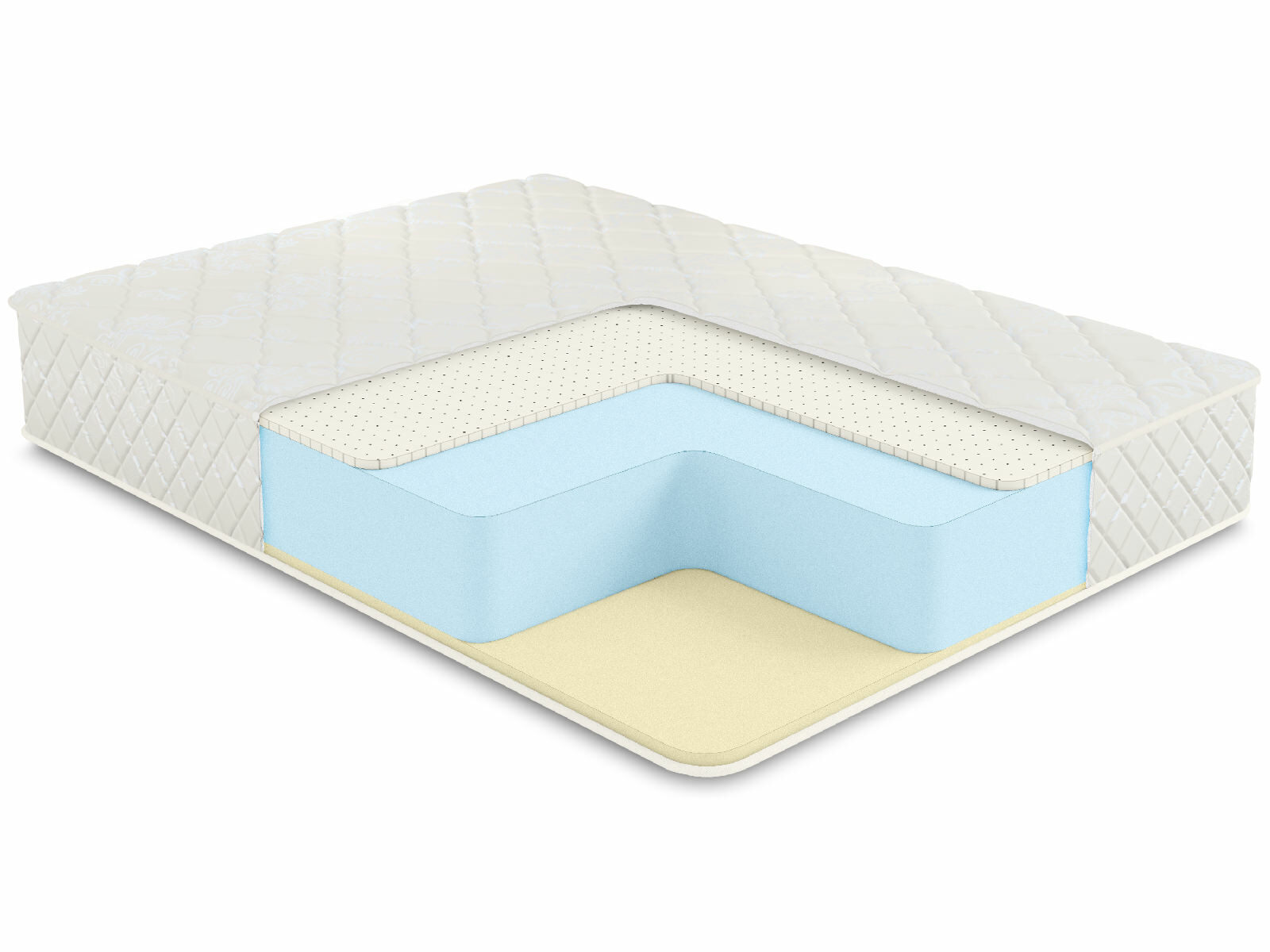 Внутри матраса установлены три различных вида наполнителей. Это природный латекс и Меморикс у поверхностей, а в центре толстый и основательный блок искусственного латекса высотой сразу 18 см. Все вместе они дают изделию общий объём, равный 21 см.