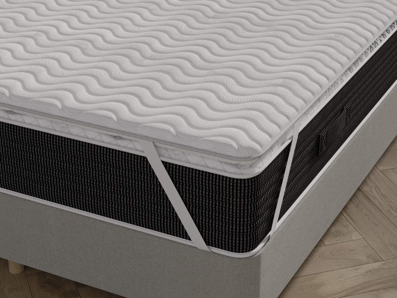 Топпер изготовлен на основе натуральных материалов. Эта модель сделает мягче жёсткие поверхности кроватей и диванов, скроет небольшие неровности, а также обеспечит комфортный отдых. Крепление осуществляется с помощью резинок по четырём углам.