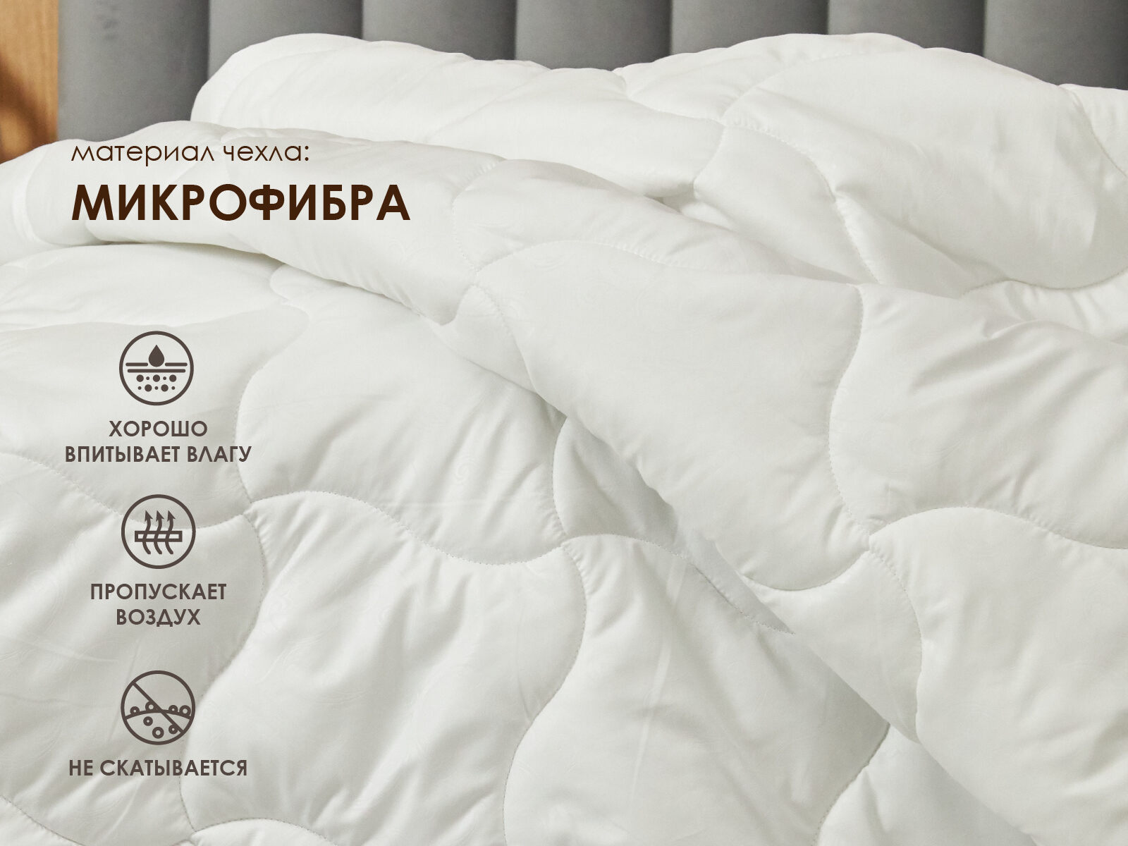 Чехол одеяла изготовлен из нежной микрофибры, которая идеально дополняет натуральный наполнитель. Эта ткань не препятствует естественной терморегуляции, что позволяет шерсти «дышать» и поддерживать оптимальный температурный баланс Хлопковая основа усиливает действие «сухого тепла», создавая дополнительный комфорт во время сна.