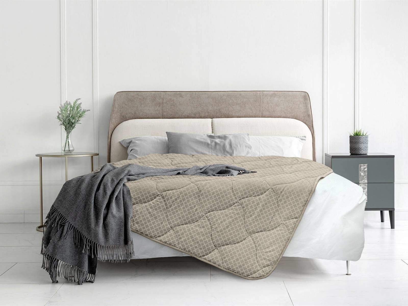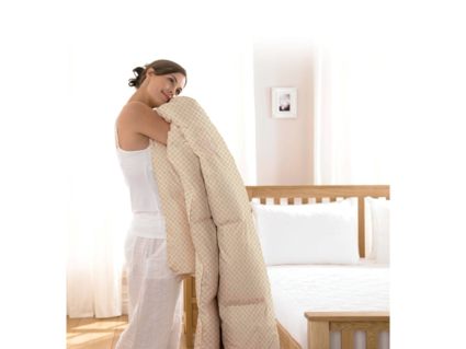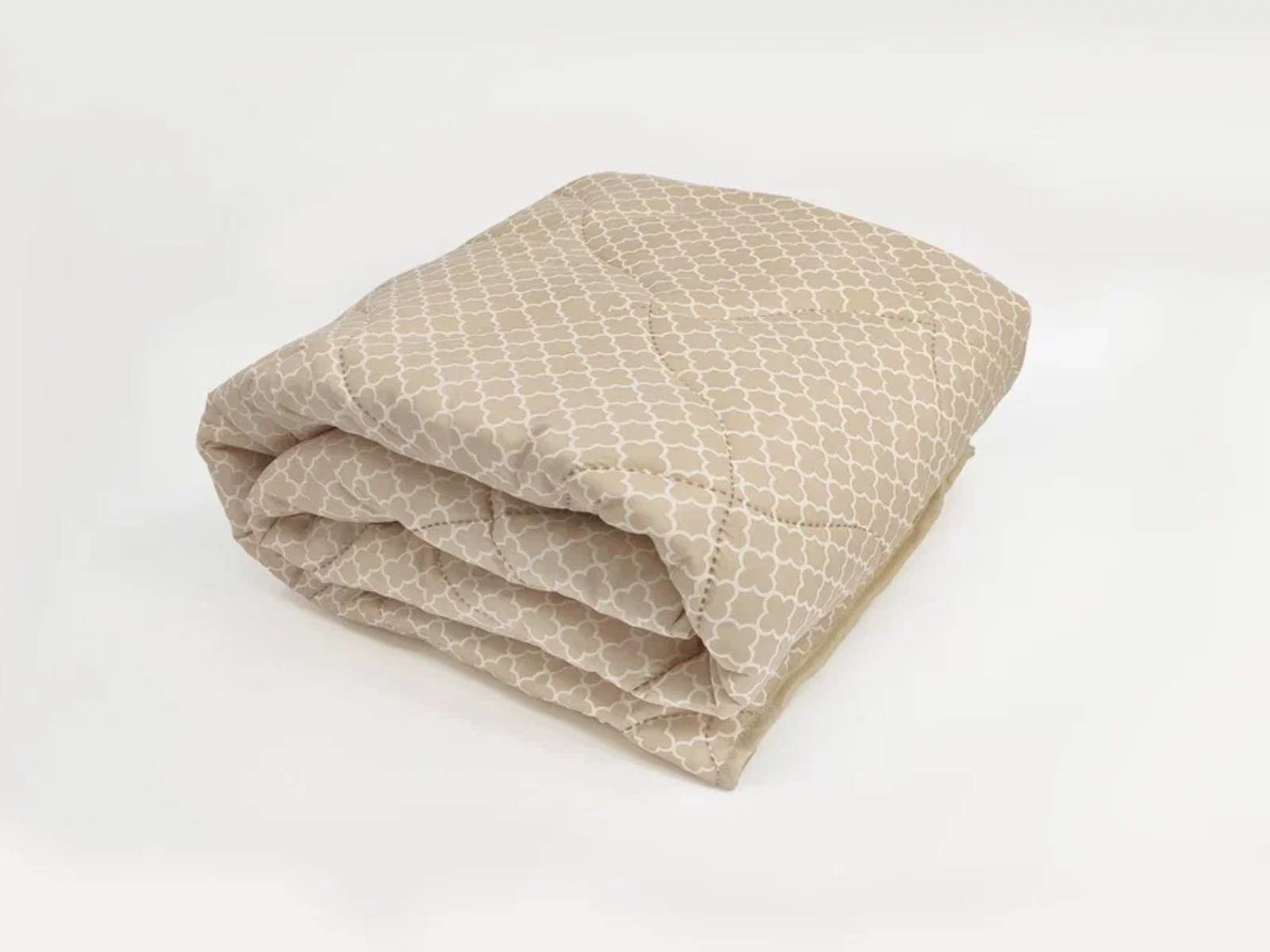Чехол одеяла выполнен в спокойном бежевом оттенке с ненавязчивым геометрическим орнаментом. В его состав входят хлопок, который обладает хорошей воздухопроницаемостью и полиэстер, делающий ткань очень прочной и долговечной. Уникальная технология безниточного скрепления Ультрастептм не только надежно фиксирует наполнитель внутри чехла, но и добавляет изделию объем.