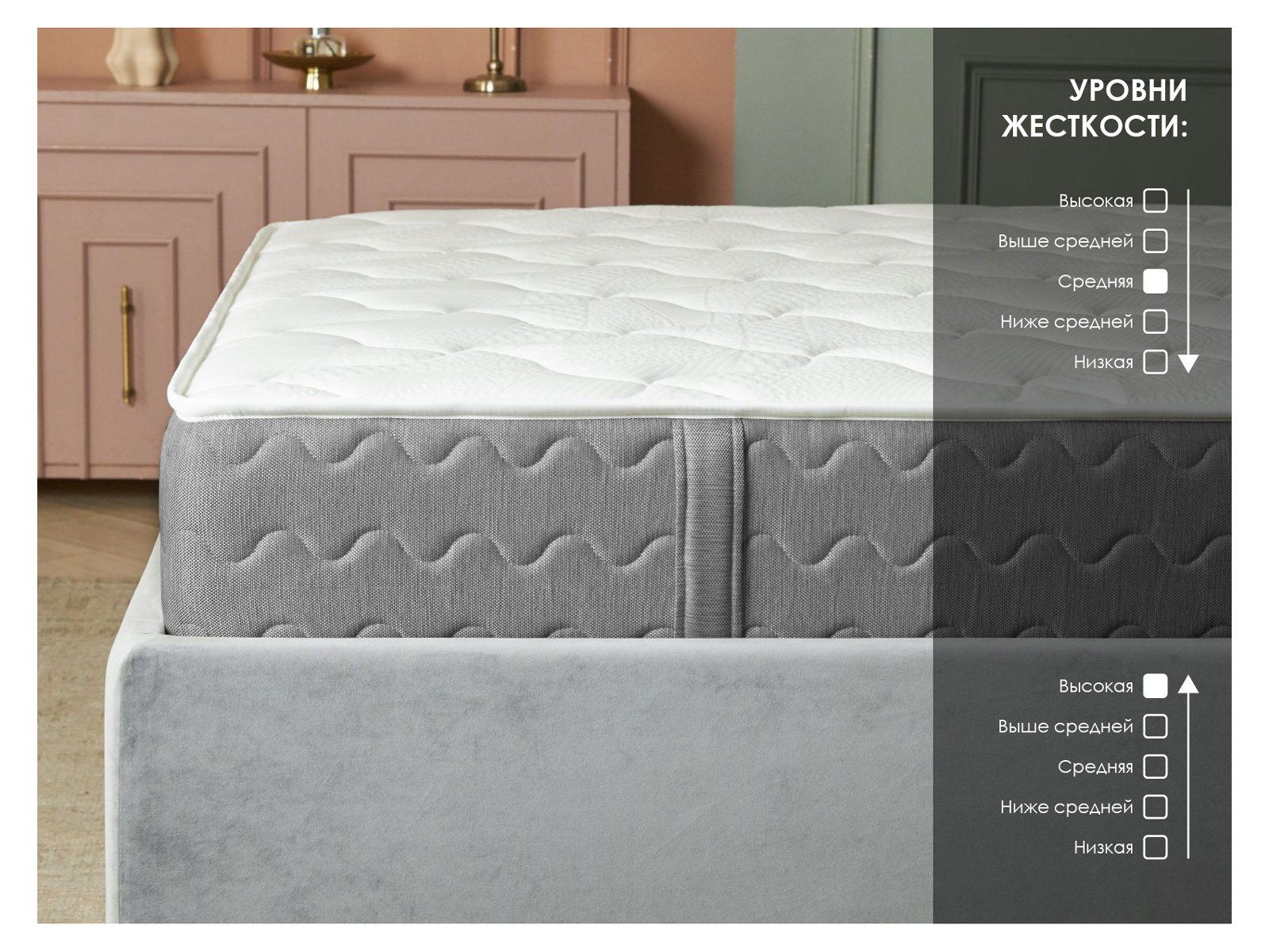Матрас даёт возможность выбора между средней и высокой жёсткостью, сохраняя выраженные ортопедические свойства и комфорт натуральных наполнителей.