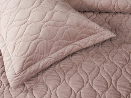 Покрывала и наволочки изготовлены из велюра высокой плотности - приятной на ощупь бархатистой ткани с коротким ворсом. Пошив покрывала с кантом, наволочки с ушками 5 см.