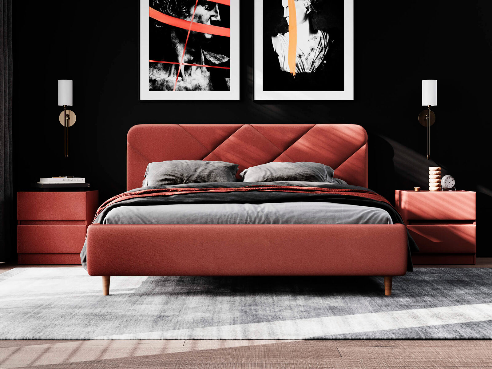 Кровать Taylor выглядит эффектно благодаря изголовью со стежкой в виде крупного абстрактного рисунка. Закругленные углы, объем и мягкость изголовья создадут в вашей спальне атмосферу релакса и уюта. Благодаря высоким опорам из натурального дерева, модель будет смотреться актуально в интерьерах в скандинавском и современном стиле.